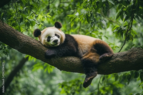 Obraz premium Panda resting comfortably on a tree branch surrounded by lush greenery during...