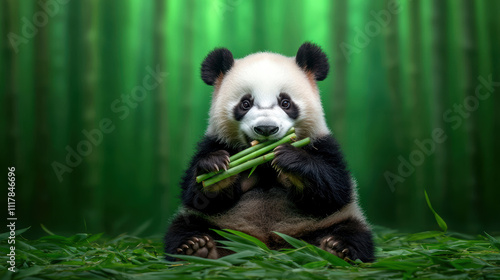 © NAD SANG PAP, Obraz premium panda sitting in bamboo forest, munching on bamboo shoots, exuding playful charm