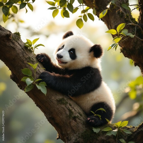 © ajiedoang, Fototapeta premium Pandas climb trees looking for insects