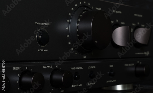 © mugurel, Fototapeta premium Panel sterowania wzmacniacza stereo. Metaliczne tło.