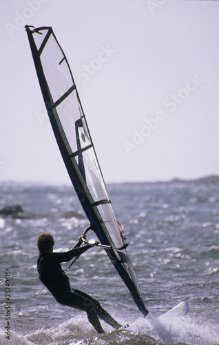 © antasfoto, Naklejka premium Panned shot of a windsurfer sailing high speed, unrecognizable person. Alghero, Sardinia, Italy