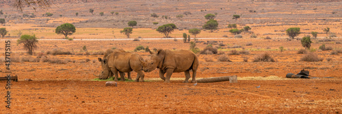 © ggfoto, Fototapeta premium Pannorama of three black Rhino at the savanna in Namibia.