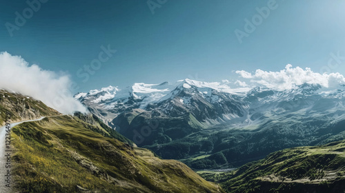 © VicPhoto, Fototapeta premium Panorámica de montañas nevadas bajo un cielo despejado