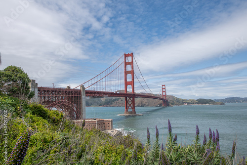 Fototapeta premium Panorama Blick mit Blumen auf die Golden Gate Bridge und Bucht von San Francisco