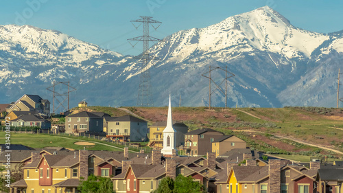 Obraz premium Panorama Buildings church and homes around golf course against snowy mountain and sky
