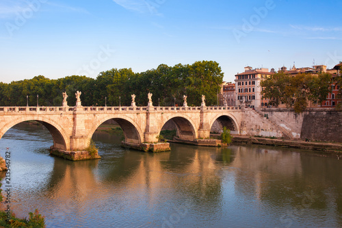 Naklejka premium Panorama cityscape from the ancient embankment Tiber in Roma at sunset. Near of bridge and castle of Angels. Saint Angelo castle and bridge is famous tourist destination in Italy