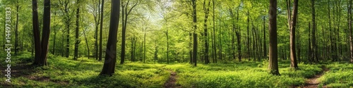 © Vlad, Fototapeta premium Panorama Forest. Idyllic Springtime Landscape with Green Foliage and Trees
