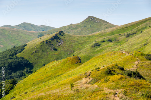 © LukaszB, Fototapeta premium Panorama from the Rozsypaniec summit to the peaks of Tarnica, Halicz, Bukowe Berdko, Krzemien, Polonina Carynska, Kopa Bukowska, Bieszczady Mountains, Wołosate