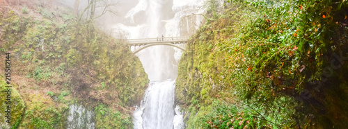 © trongnguyen, Fototapeta premium Panorama icy Multnomah Falls in winter time. It is a waterfall on the Oregon side of the Columbia River Gorge, along the Historic Columbia River Highway. Natural and seasonal waterfall background