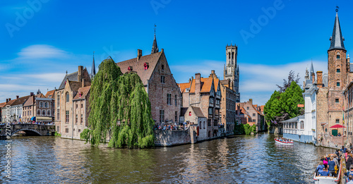 © Knipsersiggi, Fototapeta premium Panorama kanałów w Brugii - widok z Rozenhoedkaai Belgium oraz z widokiem na dzwonnicę