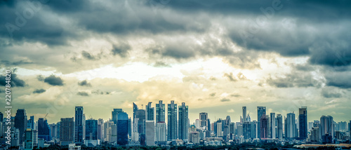 © Mongkolchon, Fototapeta premium Panorama krajobrazowa sceneria budynków i drapaczy chmur w biznesowym centrum miasta Bangko z deszczową chmurą nad miastem w niebieskim odcieniu