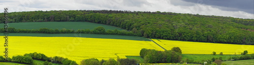 © HüSo, Obraz premium Panorama mit Blick auf ein Rapsfeld im Rheingau und einem Wald rundherum