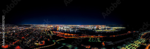 © Erik Jay, Fototapeta premium Panorama night photograph of the Port of Los Angeles, showing a wide angle covering city to sea
