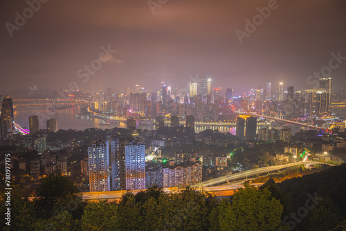 © Tatiana Kashko, Obraz premium Panorama night view of Chongqing Nan An district. Background image