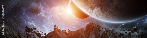 © sdecoret, Naklejka premium Panorama odległego systemu planet w przestrzeni Elementy renderowania 3D tego obrazu dostarczone przez NASA