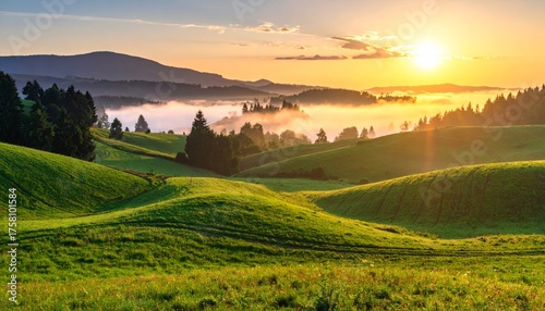 © Stefan Schurr, Fototapeta premium panorama of a beautiful, ecological farmland at sunrise. Waved, green field, forest and morning fog