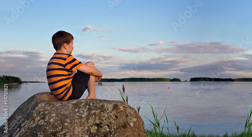 Obraz premium Panorama of a boy sitting on rock in summer evening sunlight