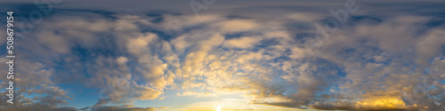 Naklejka premium Panorama of a dark blue sunset sky with golden Cumulus clouds. Seamless hdr 360 panorama in spherical equiangular format. Full zenith for 3D visualization, sky replacement for aerial drone panoramas.