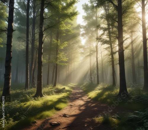 Fototapeta premium Panorama of a forest clearing with sunlight breaking through trees , light,...