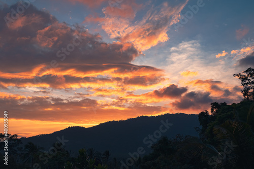 Fototapeta premium Panorama of a forest valley with mountains at colorful sunset. View from the...