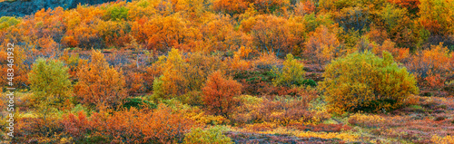 Fototapeta premium Panorama of a forest with birch tree in autumn colors in Iceland