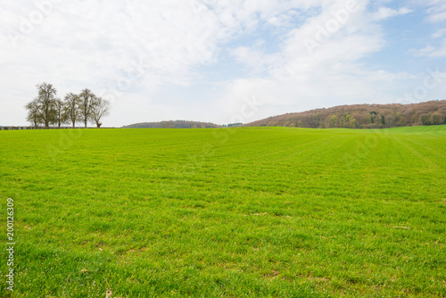 Fototapeta premium Panorama of a green meadow on a hill in sunlight in spring