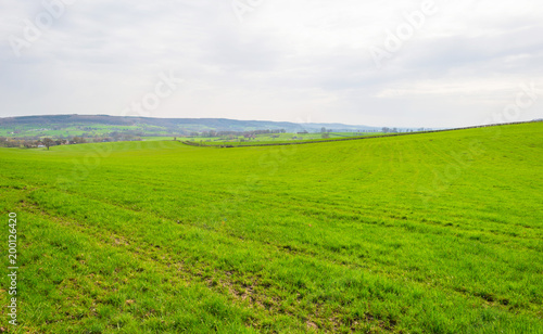© Naj, Naklejka premium Panorama of a green meadow on a hill in sunlight in spring