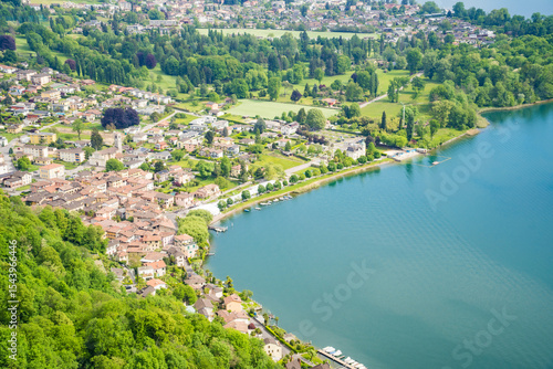© Oksana, Obraz premium Panorama of a model landscape with mountains and a lake in Switzerland, Caslano