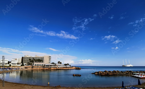 © Elena, Naklejka premium Panorama of a sandy beach in a bay, in the Mediterranean Sea, the largest sailing yacht in the world, an eight-deck motosailer against a blue sky with clouds.