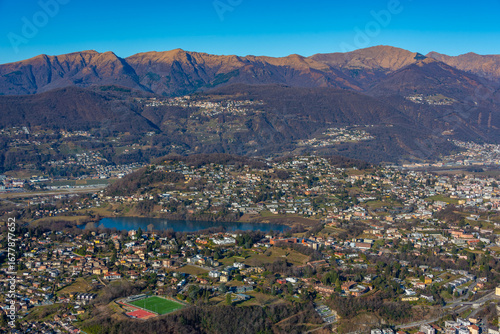 Fototapeta premium Panorama of Alps viewed behind Lugano from Monte San Giorgio in
