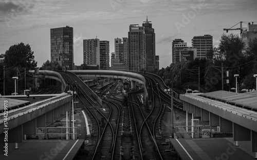 Fototapeta premium Panorama of Amsterdam with skyscrapers and metro tracks