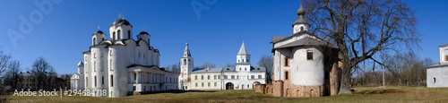 © Stanislav Samoylik, Fototapeta premium Panorama of ancient churches on Yaroslav Courtyard in historical center. Veliky Novgorod (Novgorod the Great), Russia.