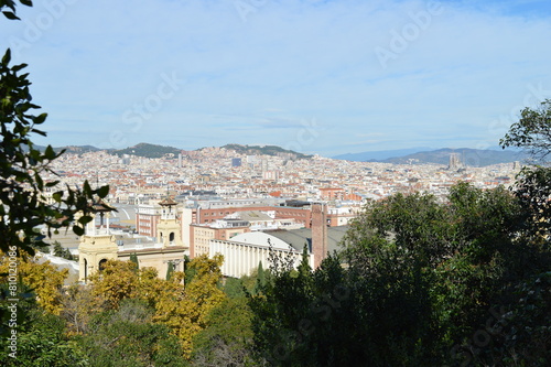 © Hanna, Obraz premium Panorama of Barcelona - urban development and historic buildings.,Catalan architecture, mountains and greenery, Spain