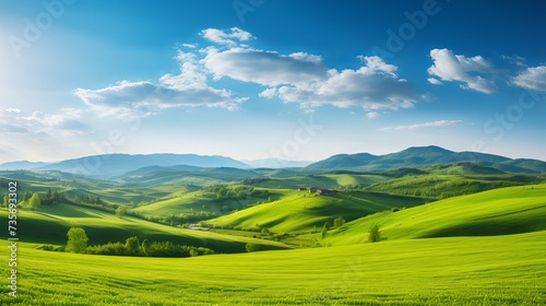 © Tahir, Fototapeta premium Panorama of beautiful countryside of romania. sunny afternoon. wonderful springtime landscape in mountains. grassy field and rolling hills. rural scenery