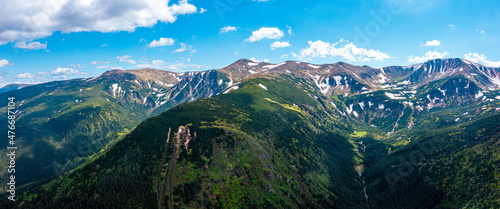 © Aerial Film Studio, Fototapeta premium Panorama of beautiful countryside of Switzerland. Sunny afternoon. wonderful springtime landscape in mountains. Grassy field and rolling hills. rural scenery