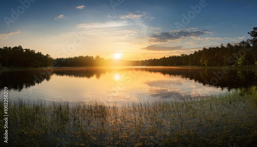 © blackdiamond67, Fototapeta premium Panorama of beautiful sunrise over lake