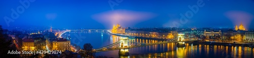 Naklejka premium Panorama of Budapest at dusk overlooking Chain bridge and Parliament. Hungary