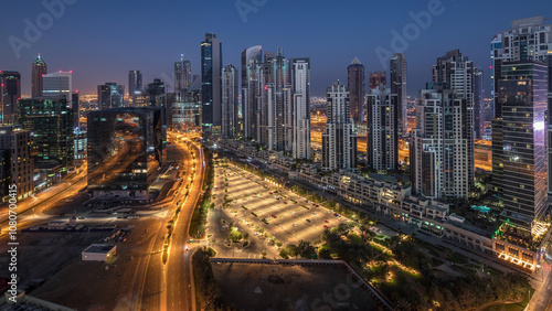 Obraz premium Panorama of Business bay Dubai night to day aerial timelapse.