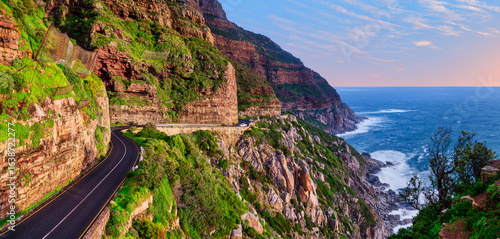Obraz premium Panorama of Chapman’s Peak Drive and the Atlantic Ocean at sunset, Cape Town,...