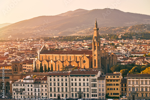 Fototapeta premium Panorama of Florence at sunset with the Basilica di Santa Croce (Basilica of the Holy Cross) illuminated by the setting sun. Basilica of the Holy Cross in sunset time.