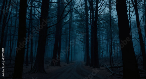 © SlayStorm, Obraz premium Panorama of foggy forest. Fairy tale spooky looking woods in a misty day. Cold foggy morning in horror forest