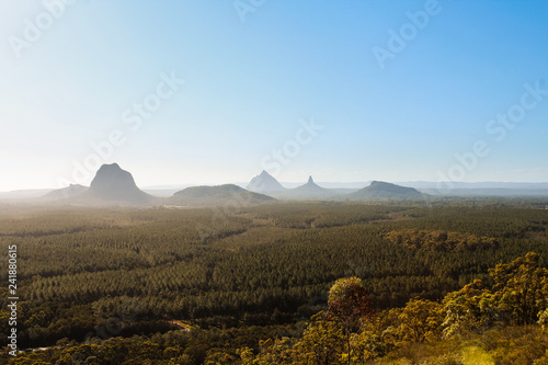 Fototapeta premium Panorama of Glass House Mountains with fog covering the picturesque mountains...