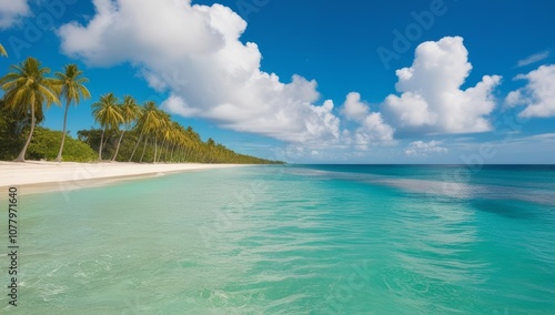 © MMM, Fototapeta premium Panorama of idyllic tropical beach with palm trees, white sand and turquoise blue water. Empty summer holidays background. advertising, paradise vacation. Panoramic empty
