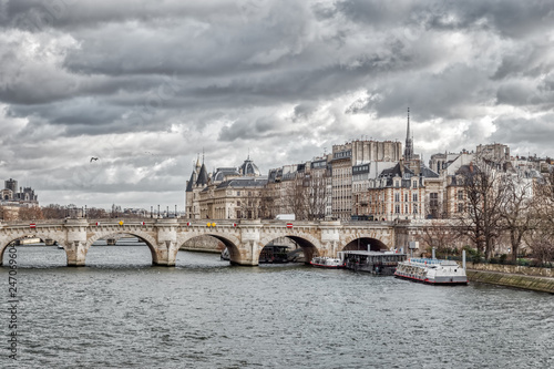 Fototapeta premium Panorama of Ile de la Cite, the Conciergerie and Pont Neuf on a cloudy day in...