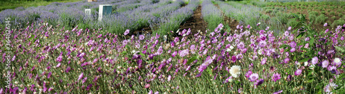 © pavlobaliukh, Fototapeta premium Panorama of lavender field and greenhouse with pink dried flowers in front