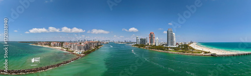 Obraz premium Panorama of Miami Beach with turquoise waters. Drone shot of Miami skyline. Top view of South Beach. Miami cityscape with luxury skyscrapers and ocean. View of Miami famous coastline.