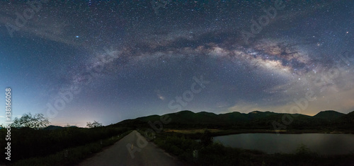 © bouybin, Fototapeta premium Panorama of Milky way over reservoir with mountain night