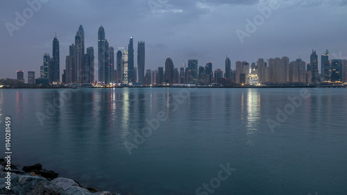 Fototapeta premium Panorama of modern skyscrapers in Dubai city night to day timelapse from the Palm Jumeirah Island.