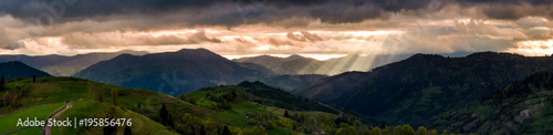 Obraz premium panorama of mountainous countryside at sunset. country road through rolling hills in to the distance. heavy clouds over the ridge. beams of lite from the heaven. beautiful and mysterious landscape