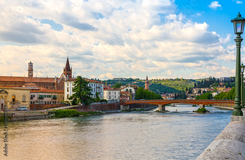 Obraz premium Panorama of old Verona with colorful buildings, channel and bridge under the...